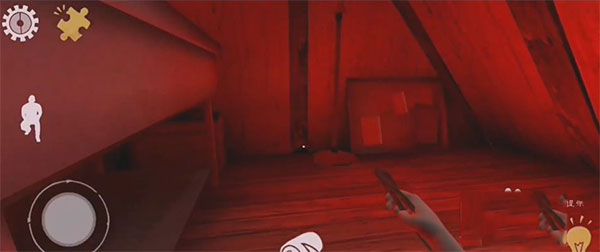 4、正式进入第一人称视角操控模式,左侧虚拟摇杆控制移动方向,右侧按钮负责互动、拾取与观察;