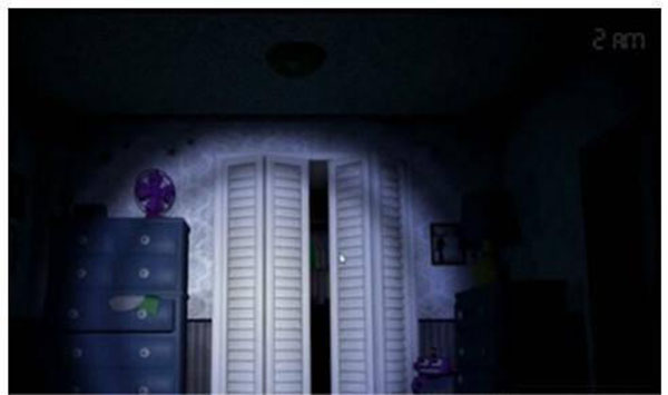 1、初始界面左右各设有一扇门,每扇门配有开关门按钮与探照灯开关。关门可暂时阻挡玩偶进入,开灯则能透过玻璃确认门外是否安全,是判断威胁的关键操作。