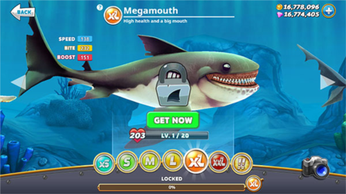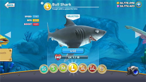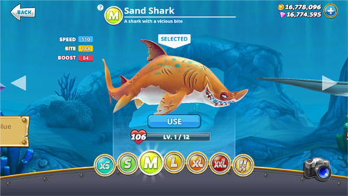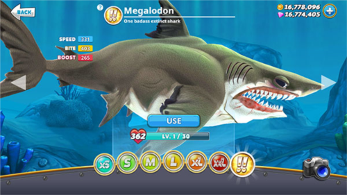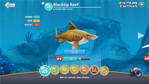 主角大白鲨具有有用的攻击力和敏捷的速度,玩家可以经过升级来提升其能力。