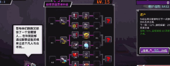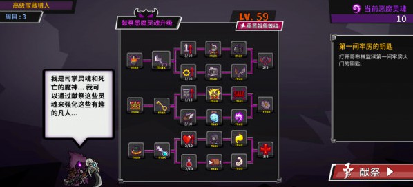 每局开始前,玩家必须经过献祭界面。在此可通过消耗“恶魔灵魂”来激活天赋,共设有三大分支、总计27项可升级天赋,直接影响角色的成长方向与战斗流派。