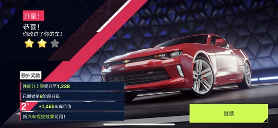 以D级经典车型雪佛兰科迈罗为例,初始状态下四维属性强化上限仅为3级,总性能上限为910;完成升星后,上限提升至8级,总性能可达1238,战斗力实现质的飞跃。