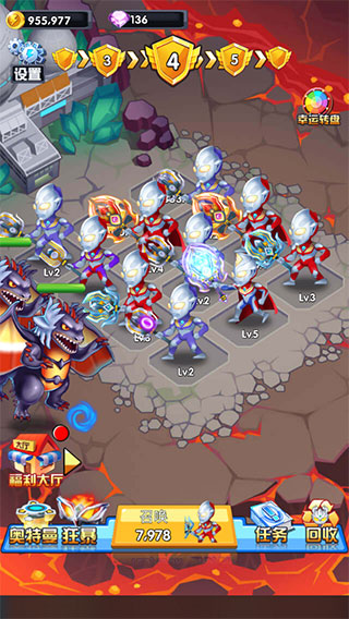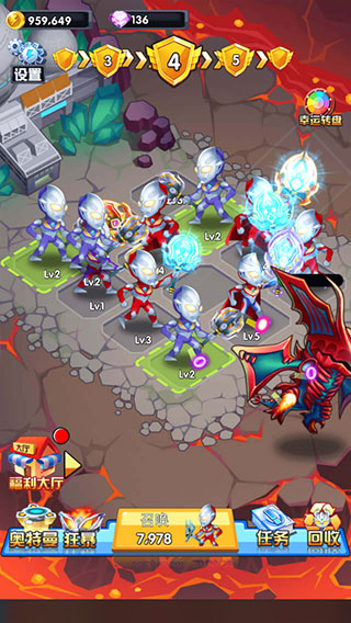 2、拖动任意奥特曼至脚下有高亮提示区域,可与其他同级角色融合升级。