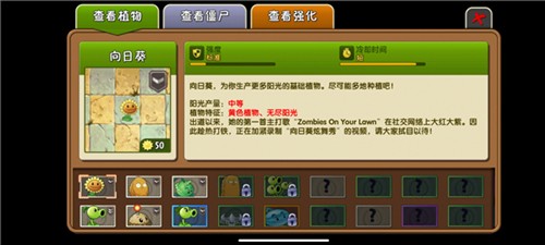 9、点击图鉴按钮,查看植物、僵尸和强化的详细介绍,帮助你了解更多游戏内容。