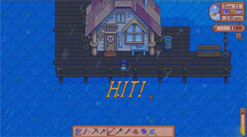 一直等到听到特殊声音的时候,可以看到头上有个“!”标志。然后水边出现hit标志。然后你就可以收杆了。