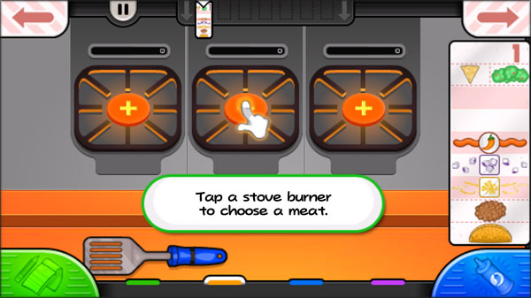 4、点击商店按钮即可进入操作区域,底部设有三个关键功能区:点餐台负责接单,烤炉台用于加热食材,制作台则是完成卷饼的核心区域。