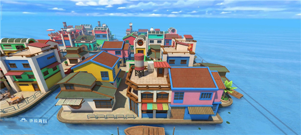 大家都知道,小丑风格的地图多表现明亮的橘色,所以中间四栋大房子呈现的主要色彩是橘色,房子中间有一个十字路口,大地图两侧是两条宽阔的街道。几棵椰树和一辆小车作为点缀,恰到好处。