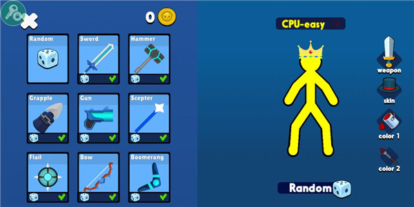 2、开始游戏前,建议先自定义你的专属火柴人形象,点击屏幕右侧即可进入皮肤与装备设置界面,打造独一无二的角色造型。