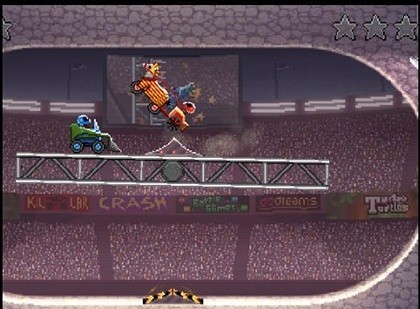 这个赛道和颠簸一样对车的性能要求较高,但与颠簸不同的是两边增加了大型旋转锯齿,所以更为更难做周旋。且这个赛道和更新之前仍做了一些变化,总的来说没什么特别大的影响,在开随机物品的情况下,体型不是很大的车压在两个炸弹上爆炸时可能会被炸飞到两个机械臂中间最终落到挡板上(如图)但这样做非常困难,我试了几十次也未能停在上面,只见过敌车这样过。这也并不会刷多少分,因为倒计时结束后会有大量陨石砸在上面很难幸免于难。说到车辆,重心不稳的车依然难以在这个赛道立足,车辆也需要能够进退自如,生死一般只在几秒之间。不推荐鬼火车,因为一旦冲过头想后退简直困难。