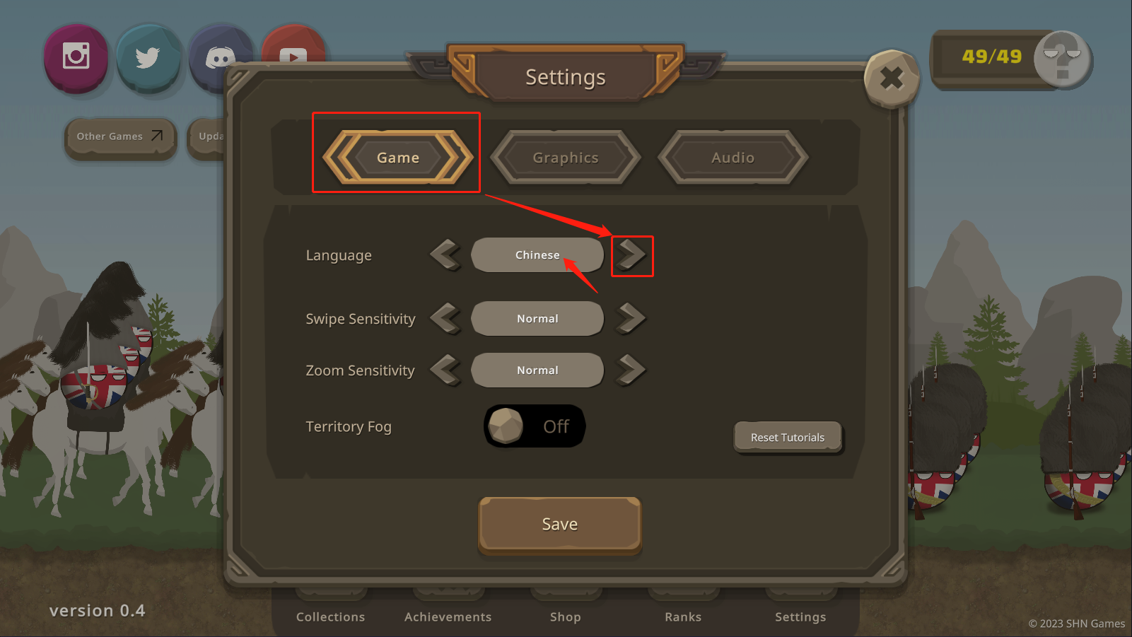 进入设置界面后,先选择【Game】选项,随后反复点击【>】方向键,直至语言列表中出现“Chinese”字样,表示已切换为中文,最后点击【save】保存更改。