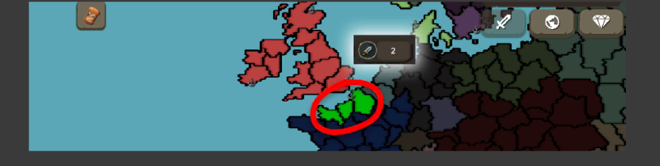 地图上闪烁的绿色区域代表可攻击或占领的目标领土。只需点击这些亮起的区域,再选择剑形图标,即可发起战斗或执行占领操作。若未看到任何闪烁提示,可能是尚未宣战,或当前攻击点数不足。每次进攻或占领将消耗1个攻击点,但该数值会在每回合自动恢复至初始值,也可通过升级学院提升上限。
