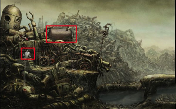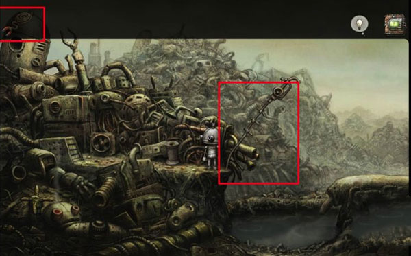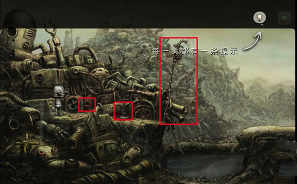 1、启动机械迷城后,会有一段简短的动画介绍,随后进入初始场景。点击画面中标注红色区域,上方的金属箱将落下机器人的躯干部分,而左下角则显示其头部,两者自动组合成完整机体;