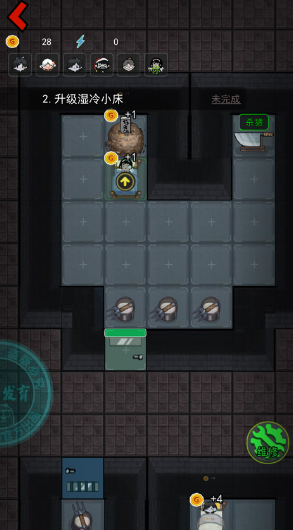 5.在倒计时5秒的时候升级床,然后升2级门,如果鬼先攻击我们,我们就建立武器,然后升级门,门快击破时可以点修复键