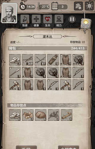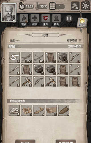 掠夺者营地很肥务必推掉,时间很充裕可以一天推一点。本关结关需要活18天,打完所有点之后每天就是找威利换石片,然后隔几天走一遍资源点。如果觉得食物压力大,请在推完营地后给二号人物断粮