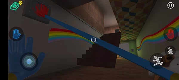 7、获得手套后会自动装备在角色手中。观察房间两侧墙面,分别印有红色与蓝色的手印标记。将对应颜色的手套贴合至相应位置,即可触发机关,打开房门。