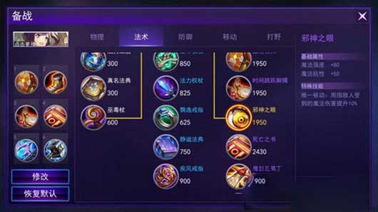 出装推荐:血色教典起手,搭配法穿鞋增强穿透能力。第三件根据局势灵活应对——若敌方物理输出强势,选择时间跳跃脚镯;若法术威胁较大,则出邪王之眼。后续依次补出死亡之书、破法曲剑、雷电法杖,全面提升爆发与持续输出。