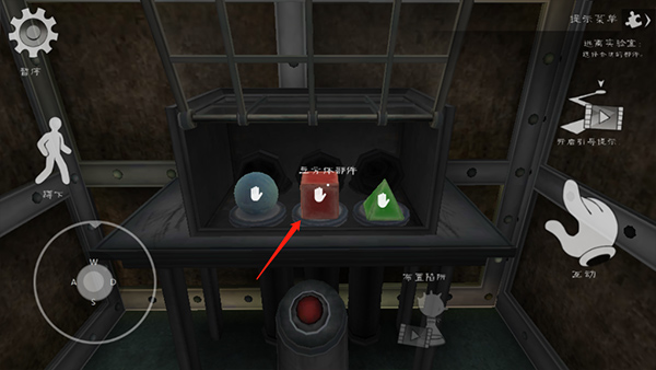 5、按下红色按钮后,前方的箱子自动开启,内部摆放着三个不同形状的物体:蓝色球体、红色立方体和绿色三角体。此时注意观察对面屏幕上的投影,显示的是红色立方体的影像,这显然是下一步的重要提示。