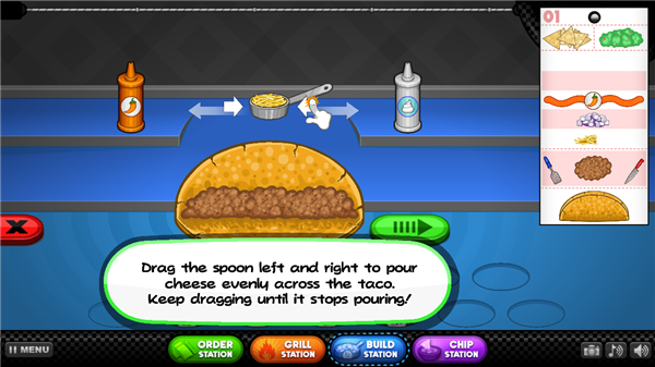 11、玩家只需左右滑动,即可撒上配菜,最后,所以配菜上完后,点击绿色方向键;
