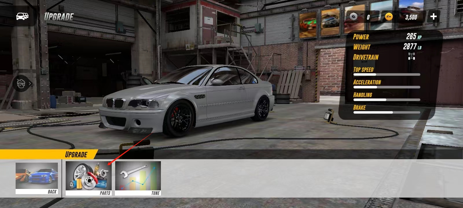 10、最后一个任务是在汽车上安装升级版,点击车库,然后再点击【UPGRADE】,点击【PARTS】,就可以在这里购买想要升级的零件。
