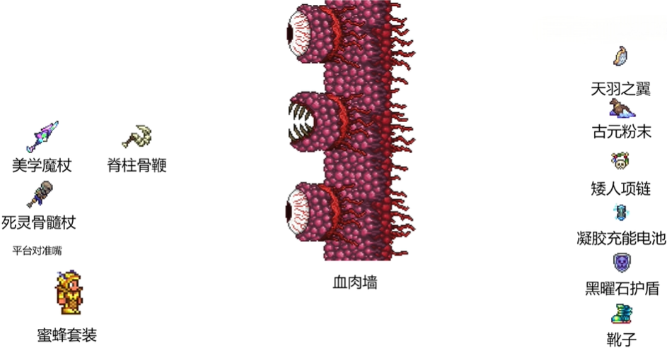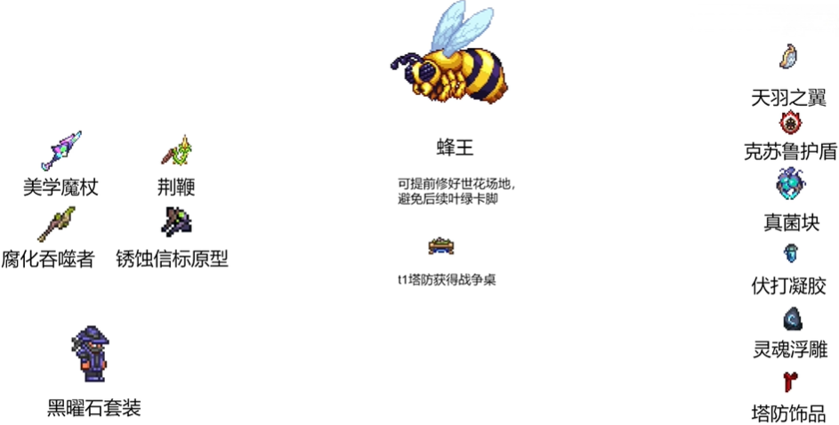 饰品:天羽之翼、矮人项链、真菌块、伏打凝胶。灵魂雕塑、塔防饰品