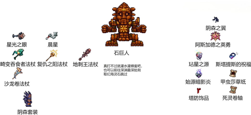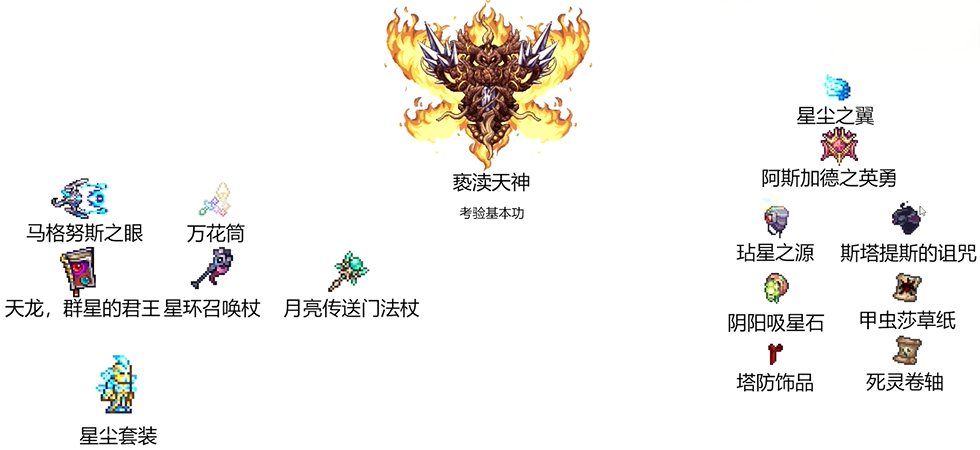 武器:星光之眼、万花筒、沙龙卷法杖、复仇之阳法杖、凋零绽放法杖、地刺王法杖、泰拉棱镜