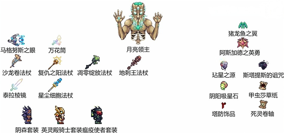 武器:马格努斯之眼、万花筒、沙龙卷法杖、复仇之阳法杖、凋零绽放法杖、地刺王法杖、泰拉棱镜、星尘细胞法杖