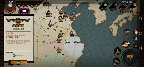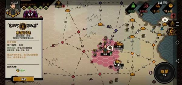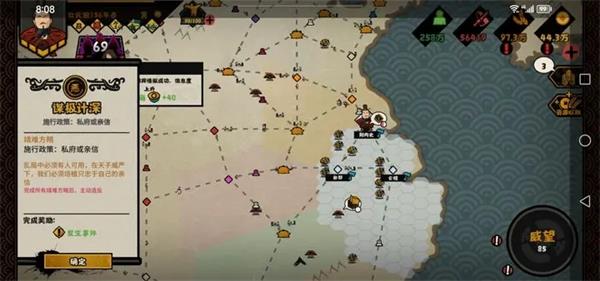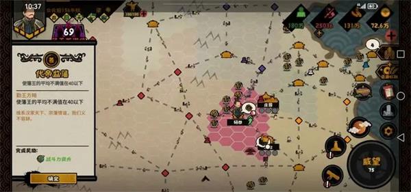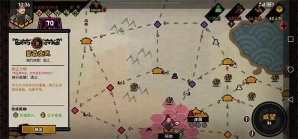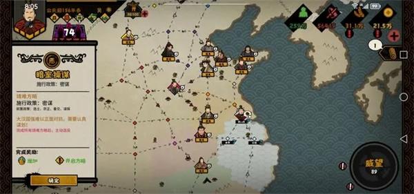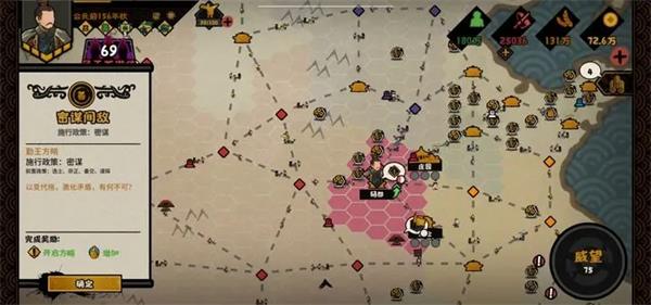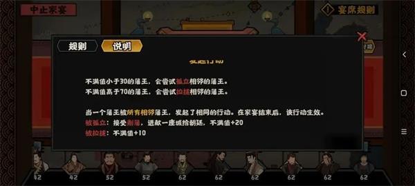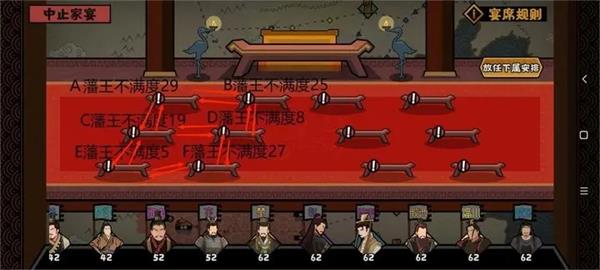 假设A-F藩王不满均低于30,则A可被B、C共同孤立而失城;B被A、D孤立;C被A、D、E孤立;D被B、C、F孤立,依此类推。反之,“拉拢”则适用于不满高于70的情况,同样需要两侧邻国配合,成功后可降低目标不满度,但会使邻近国家各增加15点不满。特别提醒:第二列与第三列因位置独立,无法参与任何孤立或拉拢操作。此外,孤立虽能夺城,但会导致该藩王不满上升20点,使用需谨慎;而拉拢虽有益于稳定局势,却可能引发周边反弹。尽管宴会座位本身有助于调节情绪,但仍建议避免任一藩王不满超过70,以防突发叛变。