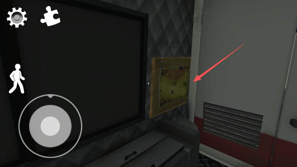 2、拾取场景中的道具是逃生关键,点击右侧“手”图标进行拿取,左侧人物按钮可让角色蹲下隐蔽