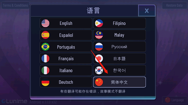 1、完成游戏下载安装后启动应用,在初始界面点击右下角的“language”按钮,