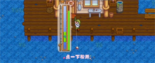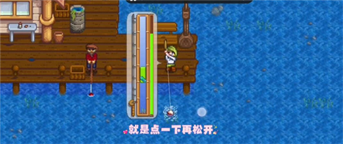 2、刚开始的时候绿条很短,我们还要通过点一下再松开的方式保持力度合适,等到右侧绿条拉满就能钓上来了