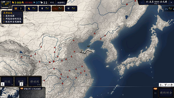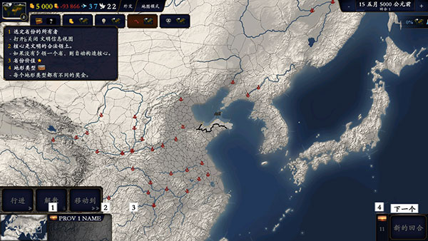 7、底部功能栏包含三项核心操作:①迷你地图,便于全局观察局势变化;②当前选中省份的详细数据展示;③回合控制按钮——完成所有部署后,点击右下角“结束回合”即可推进时间线,触发各方势力行动。