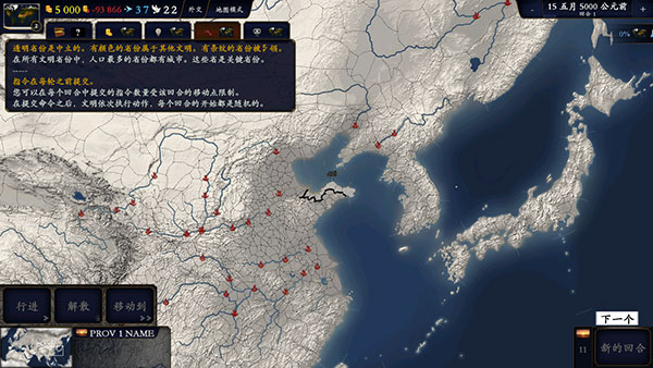 4、地图上透明区域代表中立未归属省份,彩色区块为其他文明控制区,带条纹者为被占领土。每个文明人口最多的省份均设有城市,属于核心战略要地。每回合开始前提交指令,可下达命令的数量受当回合移动点数限制。所有文明按随机顺序依次执行行动,确保每局对战节奏多变、充满不确定性。