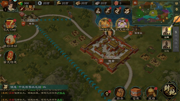 1、封地——三国时期一座繁荣的山城,分封给玩家作为封地进行发展。城池错落有致,城市繁华。这里的百姓热情善良,虽处战乱年代,但城中依旧是一番祥和安宁的景象。游戏中所有功能性建筑都建设在封地当中。