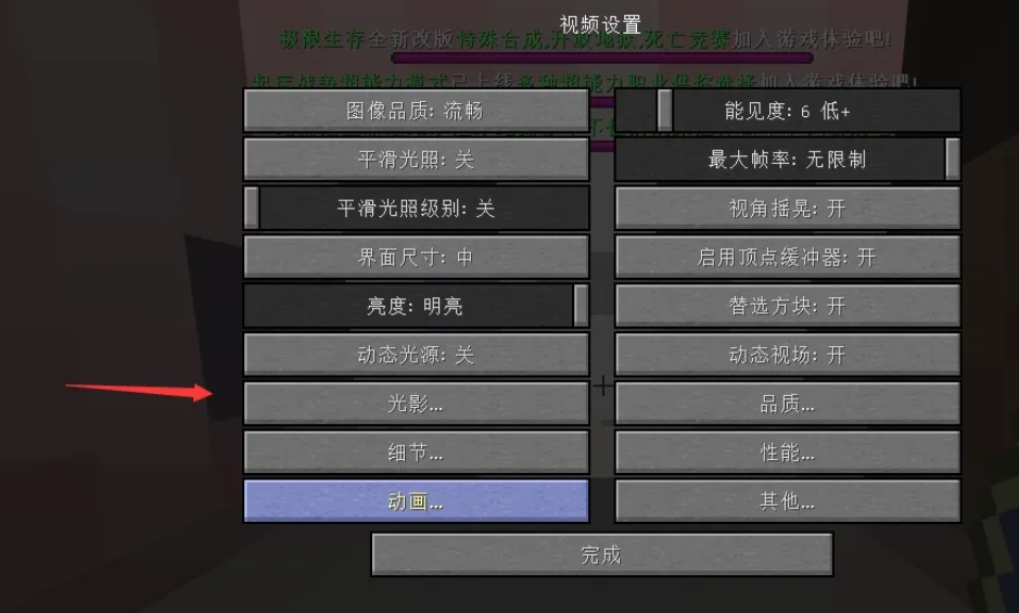 1、按下Esc键打开游戏菜单,然后点击“选项”(Options)>“视频设置”(Video Settings)>“光影设置”(Shaders Options)来访问光影设置菜单。