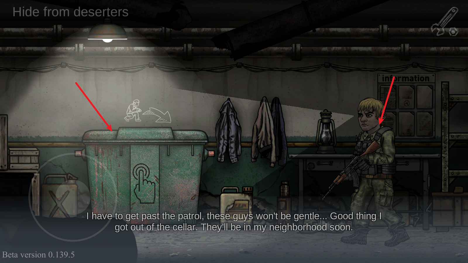 2、根据任务提示我们来到了避难所,由于是偷偷进入的,需要躲避巡逻兵,场景中有一些物品可以藏身,例如这里点击即可进去,躲避巡逻的搜查。