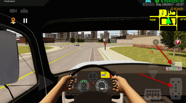 3、游戏内可以看到右下角的档位,刹车和油门按钮。在档位是D的时候,按下油门就可以操控车辆前进。