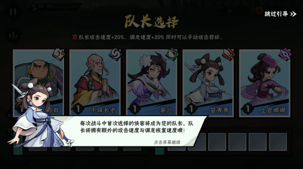 2、选择一位队长,每次战斗中首次选择的侠客将成为您的队长,队长将拥有额外的攻击速度与调息恢复速度哦!