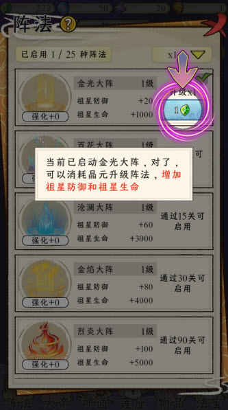 6、此外还可以启动阵法,增加祖星防御和祖星生命。