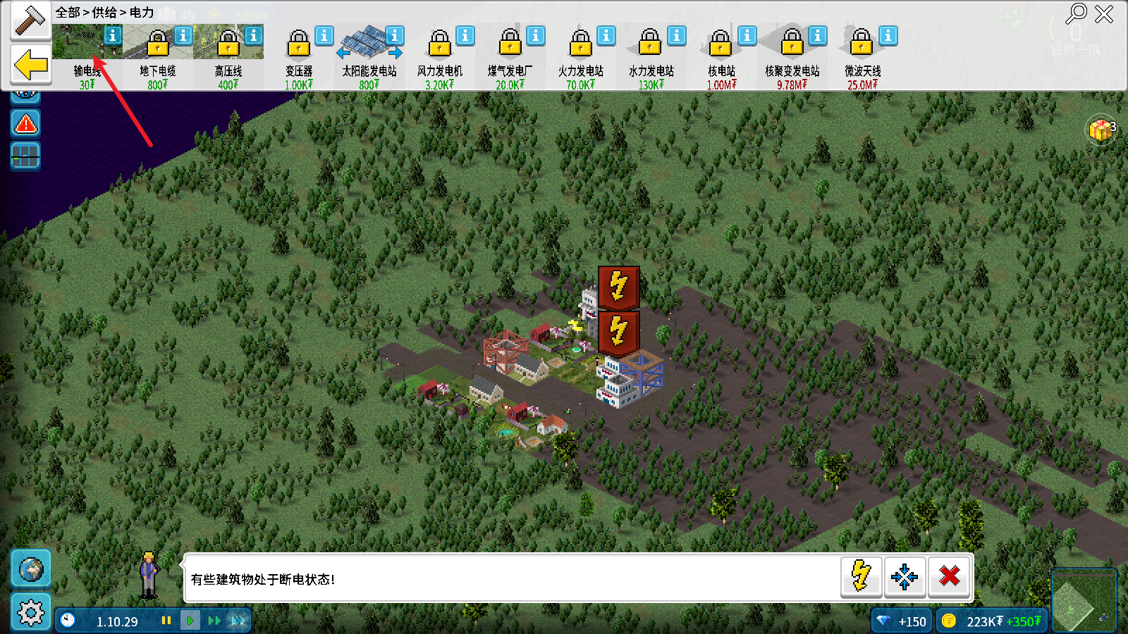 5、点击上方“供给”选项,进入电力模块,建造发电站并铺设输电线,轻松搞定供电难题。