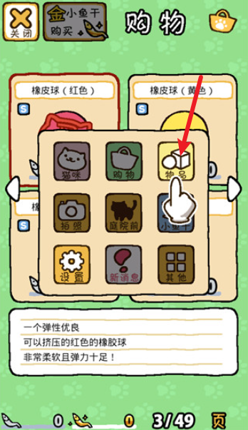 4、进入购物界面后,找到红色的像皮球,我们可以用普通小鱼干购买。