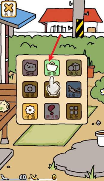 3、打开菜单栏之后,在这里可以看到购物、猫咪、物品、小鱼干等多个栏目,先点击购物。