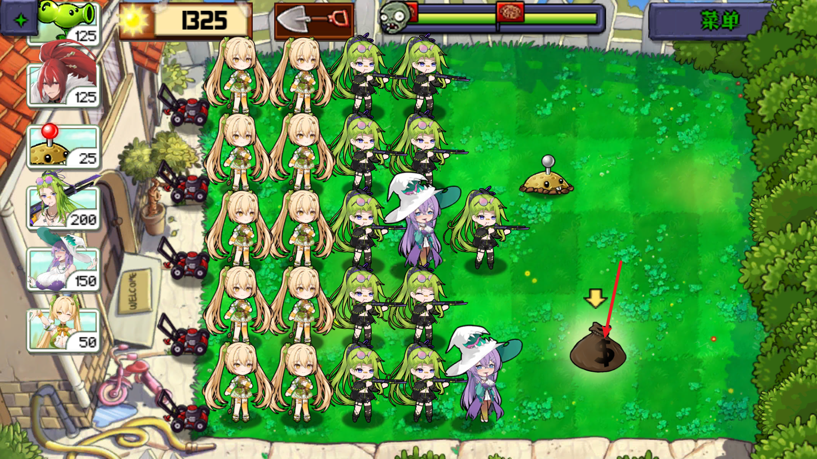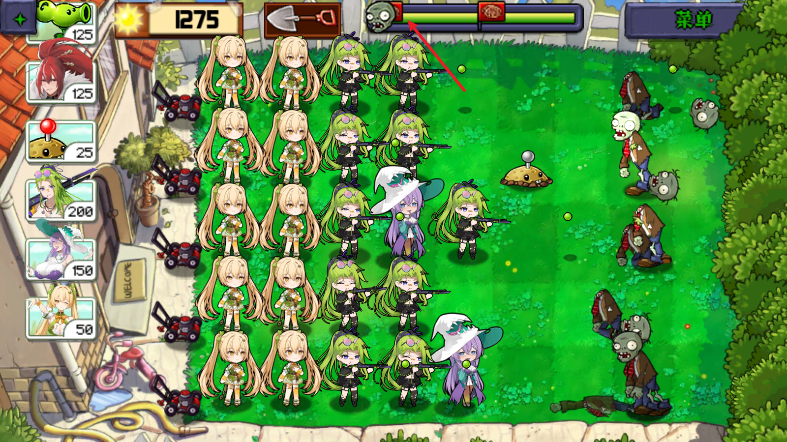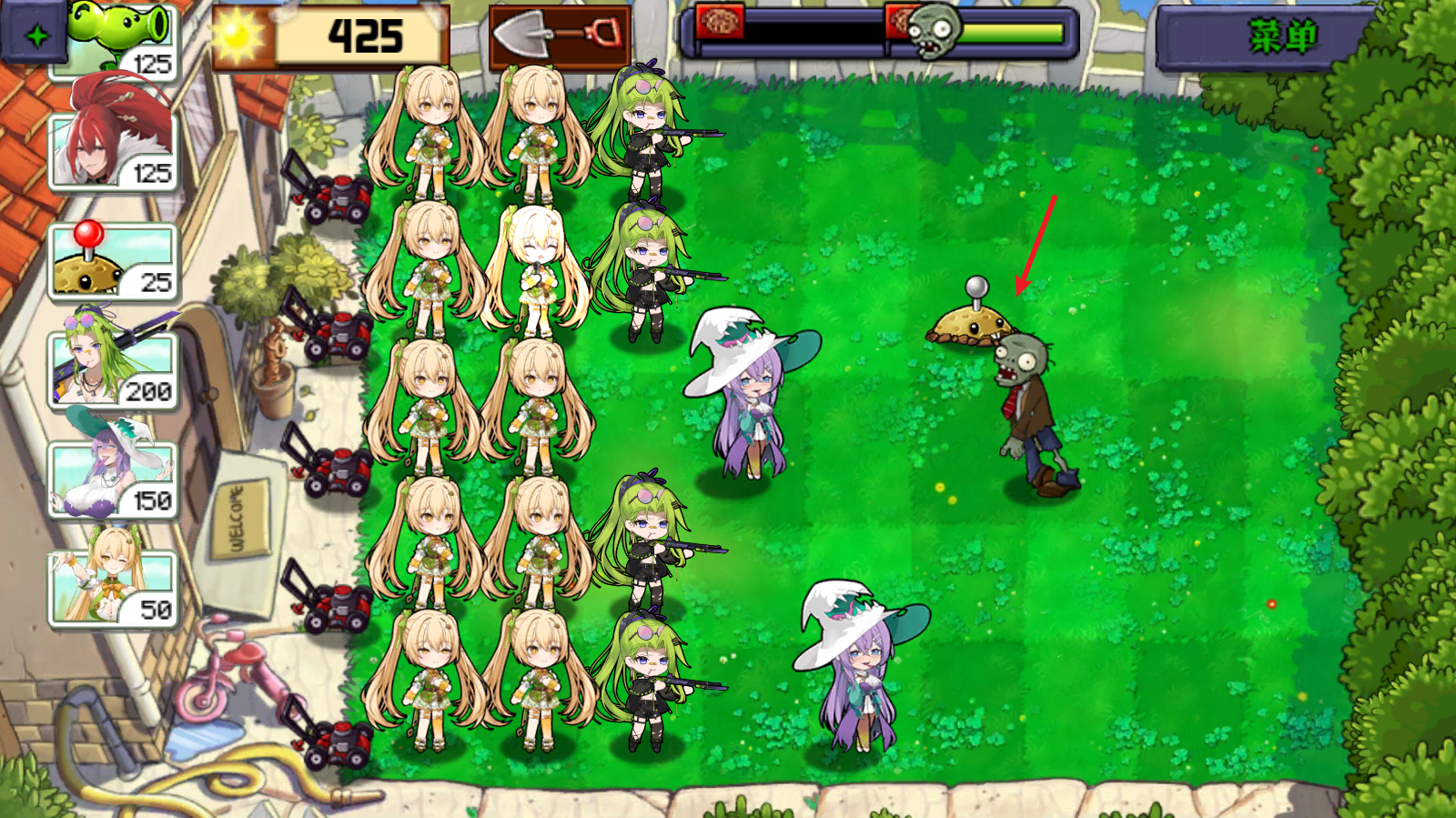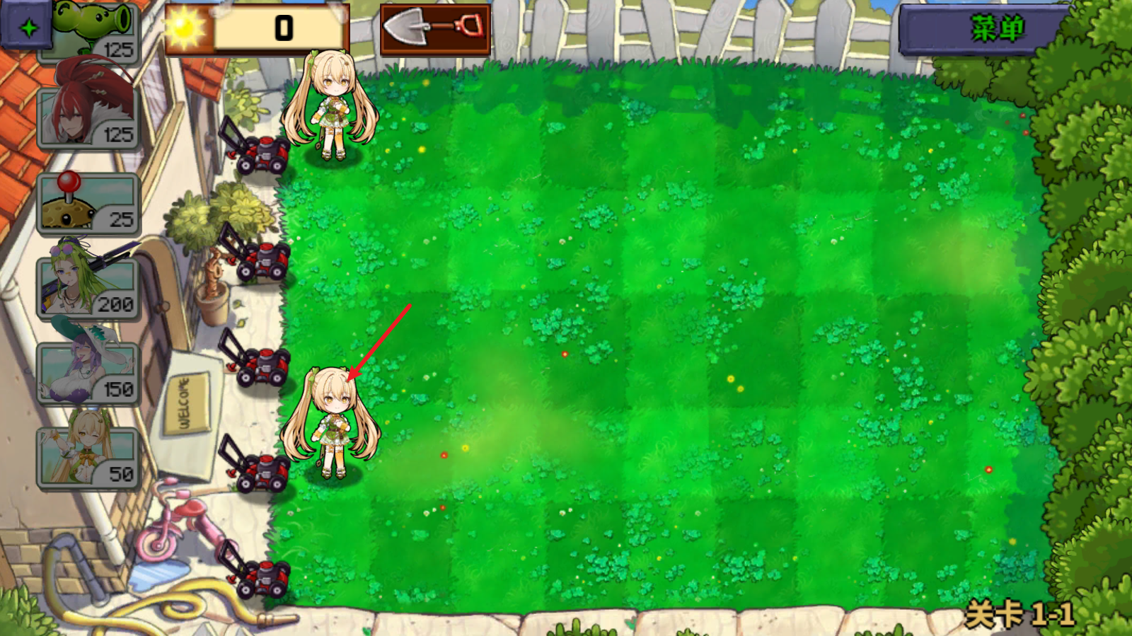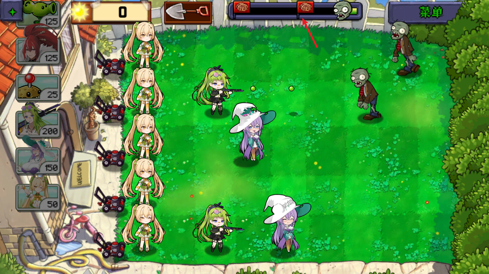 3、当僵尸出现后,我们就可以种植有攻击能力的植物娘了。