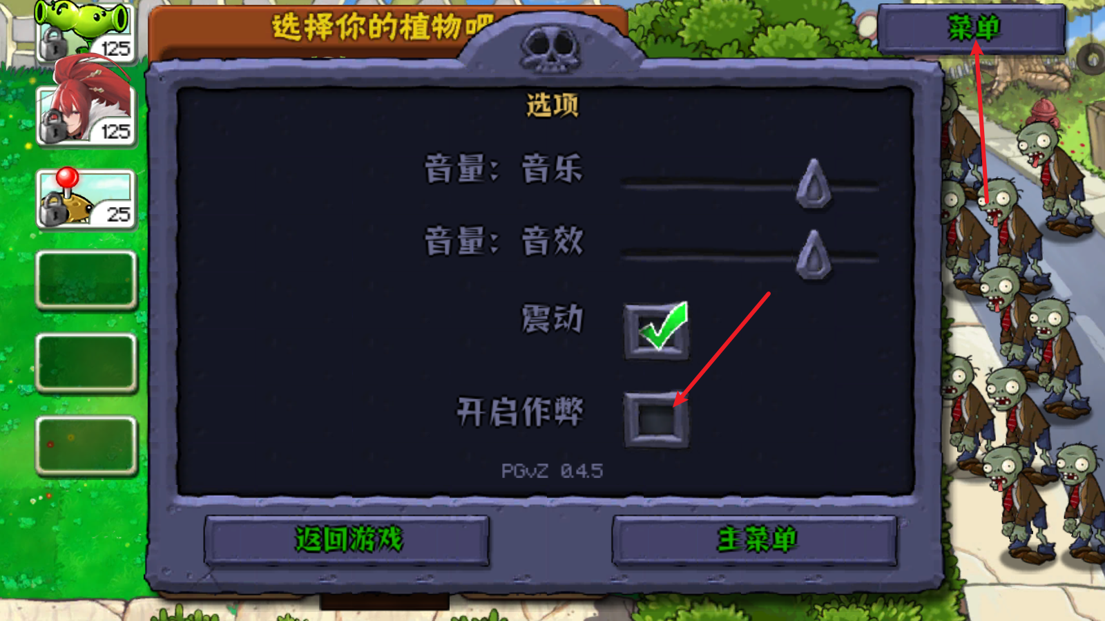 1、进入游戏后,点击右侧的菜单,勾选上开启作弊。