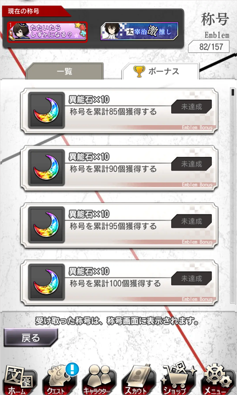 而当你收集到固定数量的称号时便会有提醒,此时既可收取异能石5~15或是其他数目是一个比较划算的收取通道