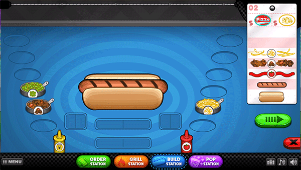 4、烤好我们就来到加料区,按照右侧的菜单将番茄酱均匀的挤到热狗上,然后再加棕色的那个豆子。依次往上加。