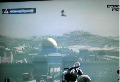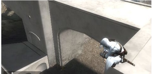 一直奔波到城里最后在最里面发现一个正在打铁的肥佬。要刺杀的就是他,谁知道他竟然能看穿阿泰尔的完美袖刀击(记得初代的黑衣服圣殿骑士也是,不过初代那家伙大概强多了比这肥佬),然后把阿泰尔扔到地上(为什么不掐死阿泰尔,真是个笨蛋),然后拿出流星锤来开打BOSS战:基本上也是没什么难度的,注意把握战斗的节奏,砍他一到后立即注意他的动作几时按R+X反击,要求完美的玩家可以向我那样子单手挑战他。失望,那时候看宣传视频的时候还以为这家伙很强。搞定他之后一直往地图所指示的地方跑,跑到城墙边后阿泰尔再次做出他的万年耍宝动作。 跳楼!!!!