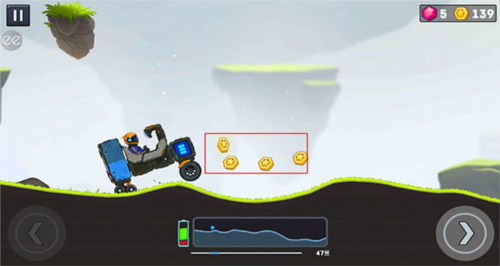 4、玩家需要通过吃金币,然后在汽油耗尽之前赶到终点;
