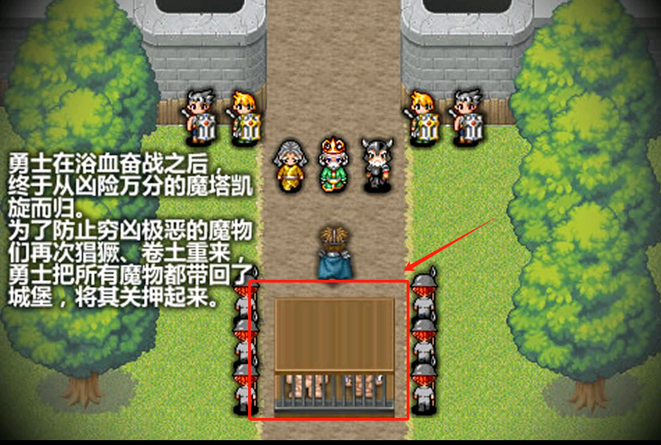 2、土路上有拿武器的村民和士兵。中间蓝色衣服角色是主角,下方木栅栏关着魔物,注意别被士兵发现。