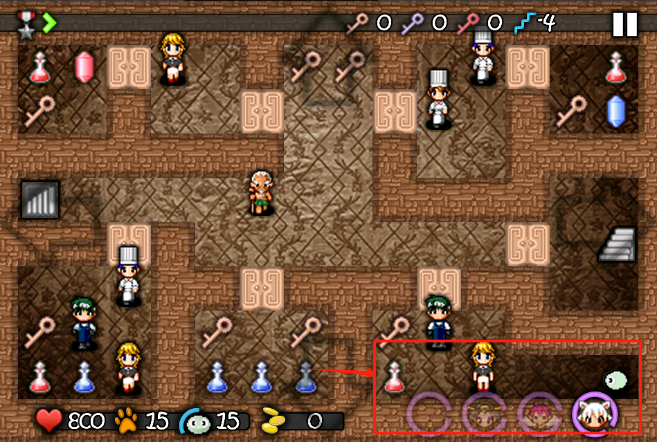 3、左上角药水补充状态,上方已获取钥匙数显示0。中间生命800步数15,右下四个圆圈是技能,按需点击使用。