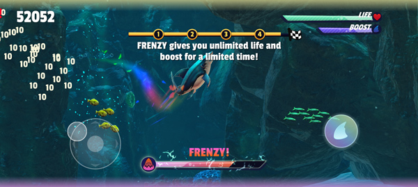 5、过完新手教程后就可开始游玩了,玩家可操纵鲨鱼吞噬小鱼,当下方能量条满后还可获取加速度,获取更多分数;