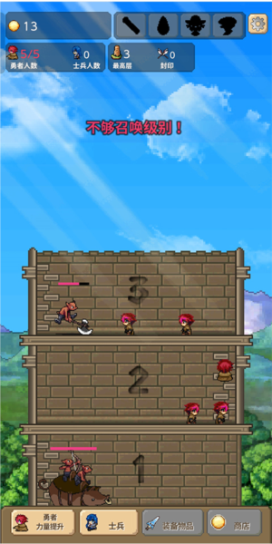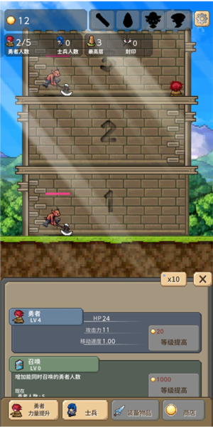 1、我们可以轻松的召唤士兵进行攻击,当然了我们也可以选择直接的进行攻击,玩家必须要升级这些人物才能帮助我们获得高分,这个是非常的关键的,在后面的塔上boss的属性非常高。